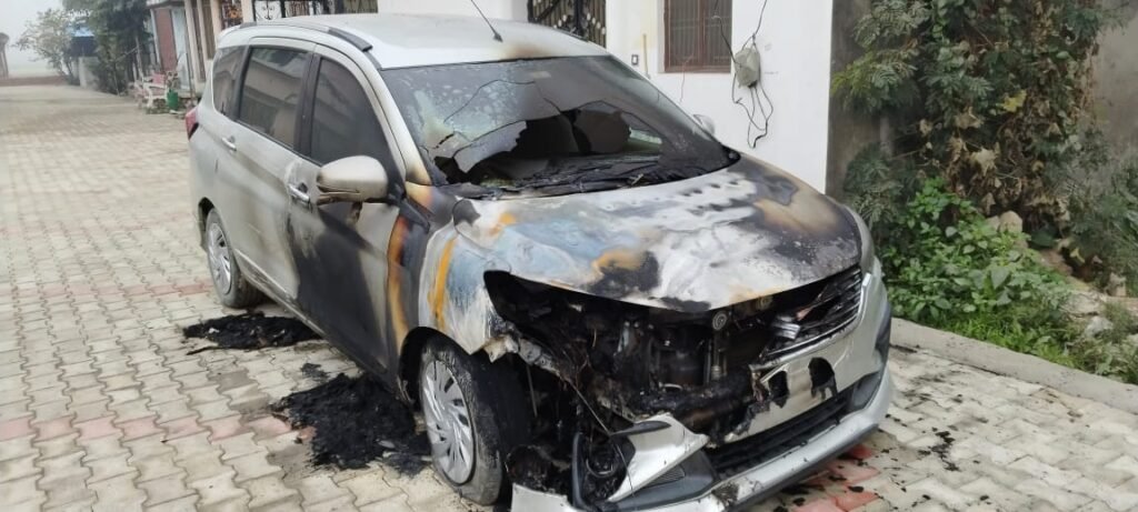 दबंग ने दंपती और बेटे को पीटा, कार में लगाई आग