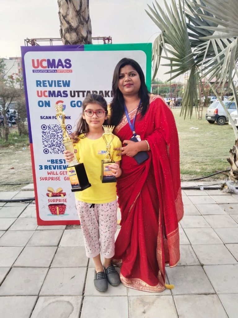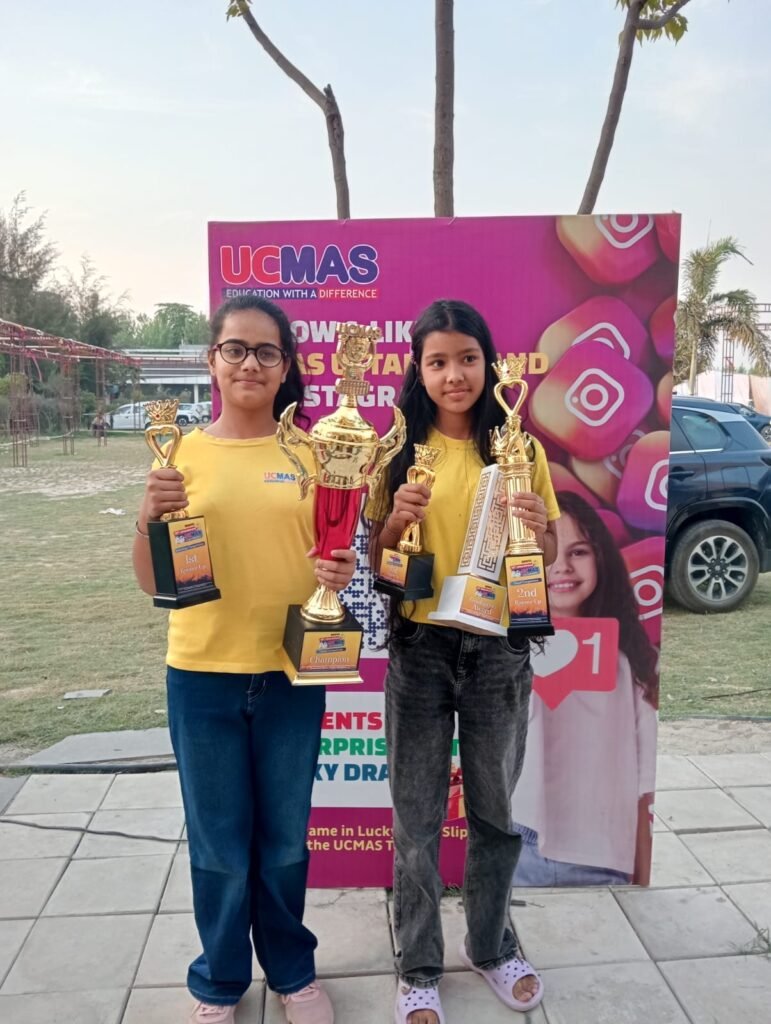 इसके अलावा कीर्तिशा यादव, सार्थक,यामिनी,रियांश चौधरी, तनिष्का भटनागर,अरनव चैत्री, भव्या गुप्ता,अरनव सक्सेना,विवान सैन, अवनी सैन,हिमार्दी जोशी,सिमरन, आरना अग्रवाल, समर्थ,श्रिहिता,व निमिर्त सैनी, रनरअप व अपने-अपने वर्ग विजेता रहे। यूसीमास की ट्रेनर रचना ने बताया कि परीक्षा में बच्चों ने 8 मिनट के अंदर लगभग लगभग 200 कठिन प्रश्नों का उत्तर दिया और जिन बच्चों ने सबसे जल्दी दिया है, उन बच्चों को प्रथम पुरस्कार दे करके सम्मानित किया गया