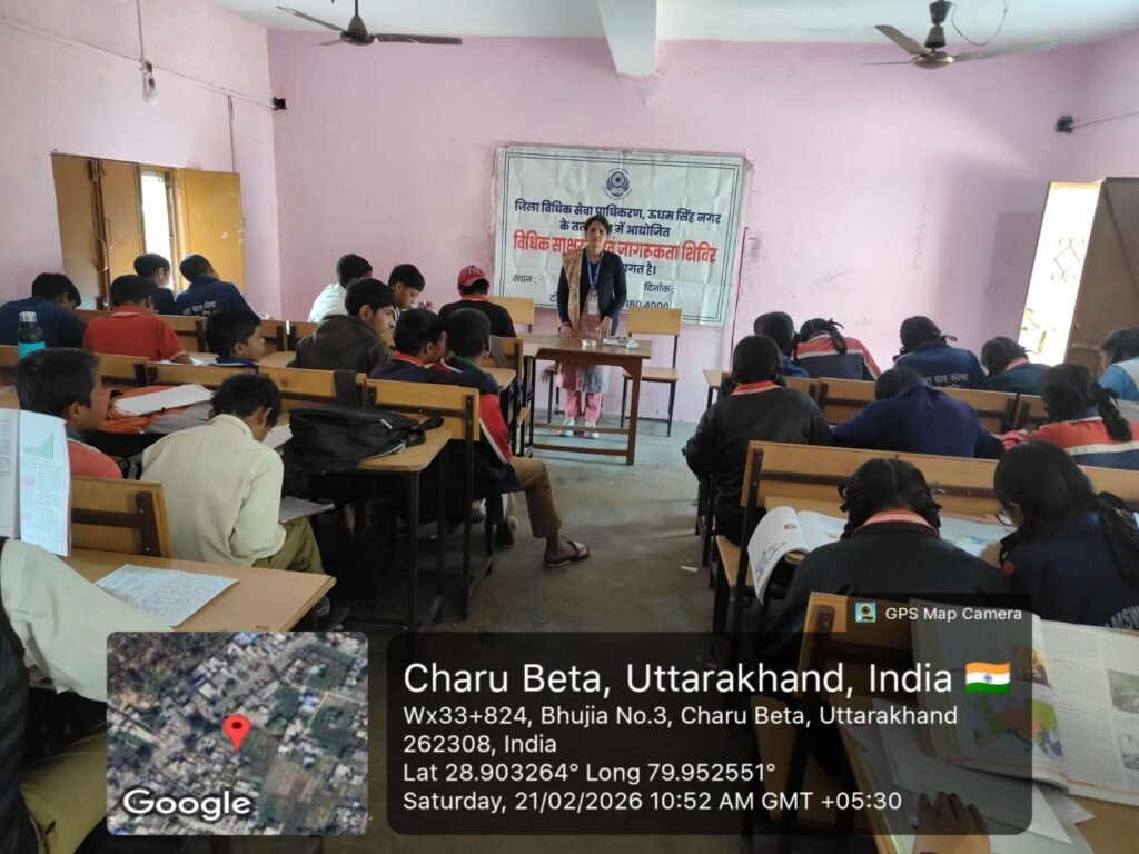 टीम के पैरालेगल वालंटियर गीता शर्मा, प्रीती राना, लाल सिंह , द्वारा विधिक कैंप का आयोजन कर छात्र-छात्राओं को “नालसा, मानव तस्करी ,और यौन शोषण ,के प्रति महिलाओं वह लड़कियों के लिए कानूनी योजनाएं बताकर नशे के प्रति जागरूक किया गया। लगने वाली 14 मार्च 2026 को “राष्ट्रीय लोक अदालत ,की जानकारी देकर जिला विधिक सेवा प्राधिकरण उधम सिंह नगर मैं परमानेंट “स्थाई लोक अदालत, की जानकारी देकर “साइबर क्राइम, मोटर एक्ट ,पोक्सो अधिनियम, वह “मौलिक अधिकारों, वह कर्तव्य की जानकारी देकर “नालसा टोल नंबर फ्री 0 – 15100 इत्यादि की जानकारी देकर 50 छात्राओं को विधिक कैंप के माध्यम से जागरूक किया।